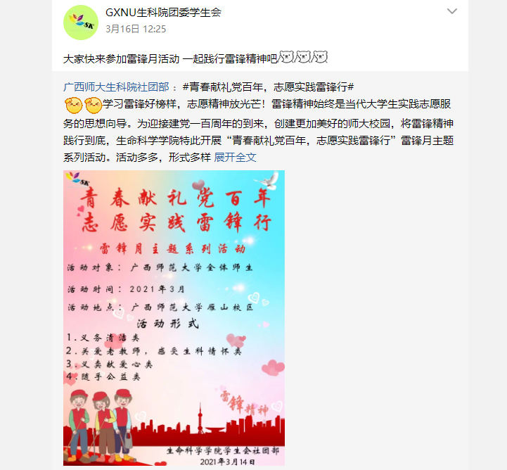 本次“青春献礼党百年,志愿实践雷锋行”雷锋月系列主题活动,生命科学学院深入贯彻落实习近平总书记关于学习雷锋的重要论述和重要批示精神,积极培育生科学子践行社会主义核心价值观,大力弘扬“奉献、友爱、互助、进步”的志愿服务精神,彰显出了生科学子作为新时代的接班人,认真传承和弘扬雷锋精神,诠释新时代雷锋精神的积极态度,用实际行动献礼建党百年。
