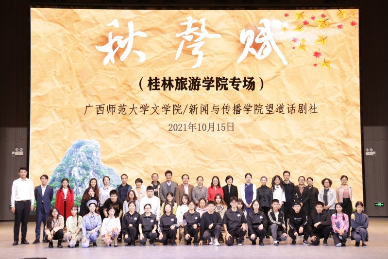 10月15日,广西师范大学文学院/新闻与传播学院望道话剧社排演的话剧《秋声赋》在桂林旅游学院演艺中心上演。广西师范大学文学院/新闻与传播学院党委负责人,“新西南剧展”总策划、桂林旅游学院文化与传播学院负责人以及桂林旅游学院600余名师生共同观看了演出。
