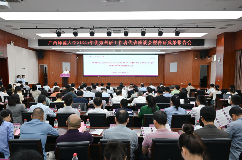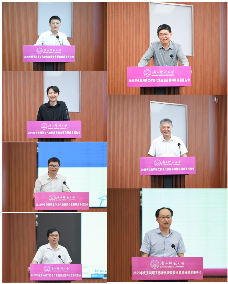 在座谈会环节,两位优秀中青年科研工作者代表、两位科研工作特殊贡献教师先后进行交流发言;在科研成果报告会环节,2025年“登峰计划”项目负责人及团队成员代表、2024年广西科学技术奖提名项目代表分别作了专题学术成果报告。