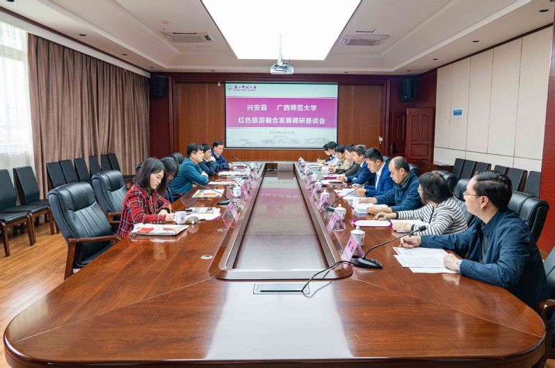 3月29日,兴安县委书记贲黄文一行五人来到我校,就红色旅游融合发展进行座谈和交流。校党委常委、副校长黄文韬出席座谈会并致辞,校办、社科处、继续教育学院、干部教育培训学院等部门的相关负责人参加座谈会。