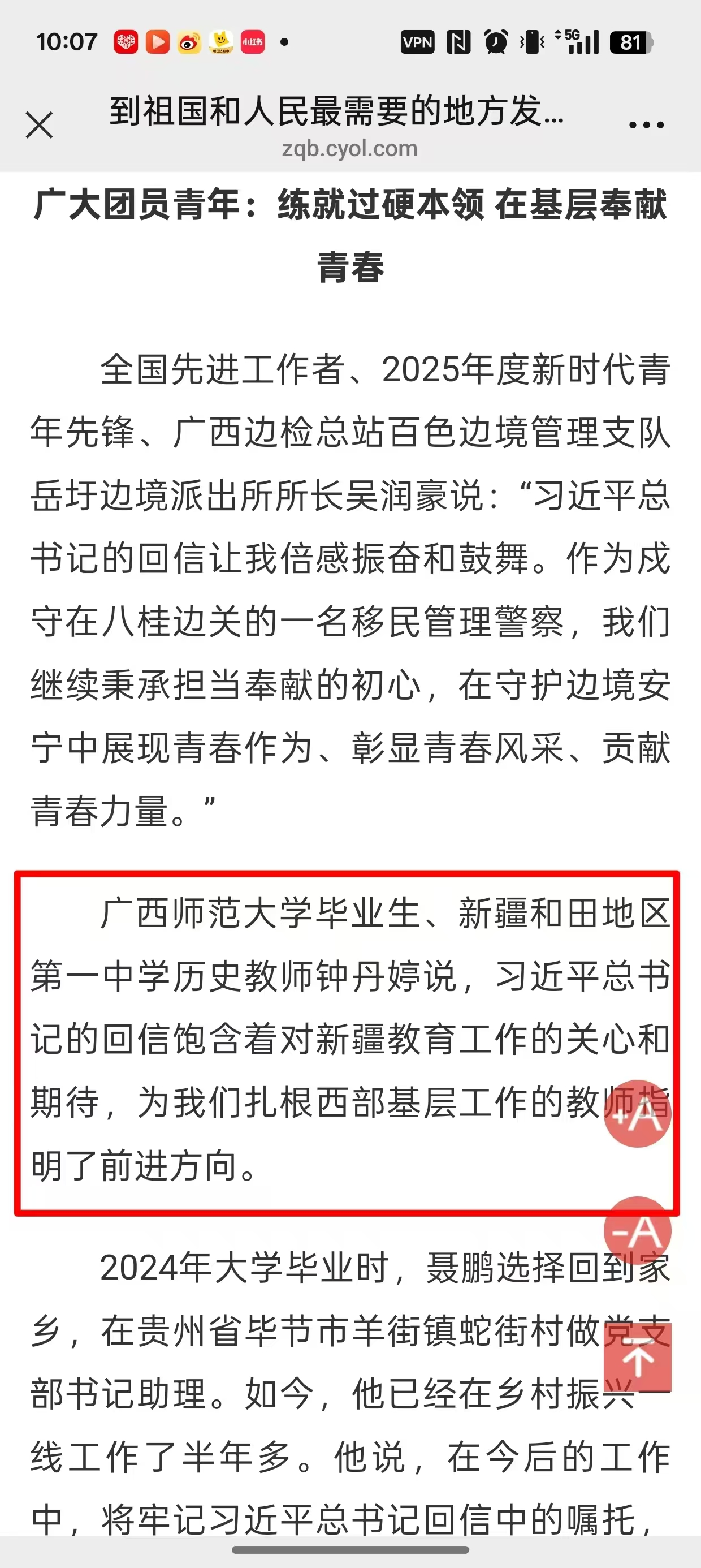 广西师范大学毕业生、新疆和田地区第一中学历史教师钟丹婷说,习近平总书记的回信饱含着对新疆教育工作的关心和期待,为我们扎根西部基层工作的教师指明了前进方向。