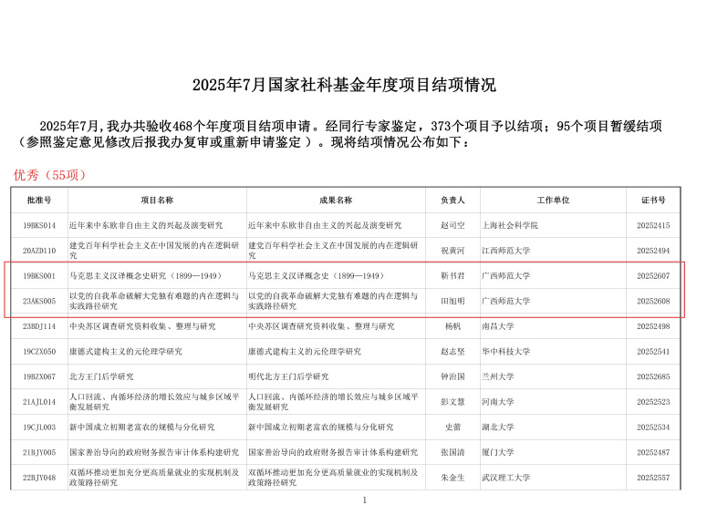 近日,全国哲学社会科学工作办公室公布了《2025年7月国家社科基金年度项目结项情况》,我校马克思主义学院靳书君教授主持的一般项目《马克思主义汉译概念史研究(1899—1949)》(19BKS001),田旭明教授主持的重点项目《以党的自我革命破解大党独有难题的内在逻辑与实践路径研究》(23AKS005)获评“优秀”等级。