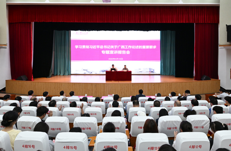 为深入学习宣传贯彻习近平总书记关于广西工作论述的重要要求,铸牢中华民族共同体意识,推动党的创新理论有效触达青年群体,根据自治区党委宣传部《理论宣讲青年群体全覆盖三年行动计划工作方案》安排,4月18日,我校在育才校区举行学习贯彻习近平总书记关于广西工作论述的重要要求专题宣讲报告会。校党委书记贺祖斌作题为《凝心聚力建设新时代壮美广西》的专题宣讲报告。校党委常委、副校长沈星灿主持报告会。