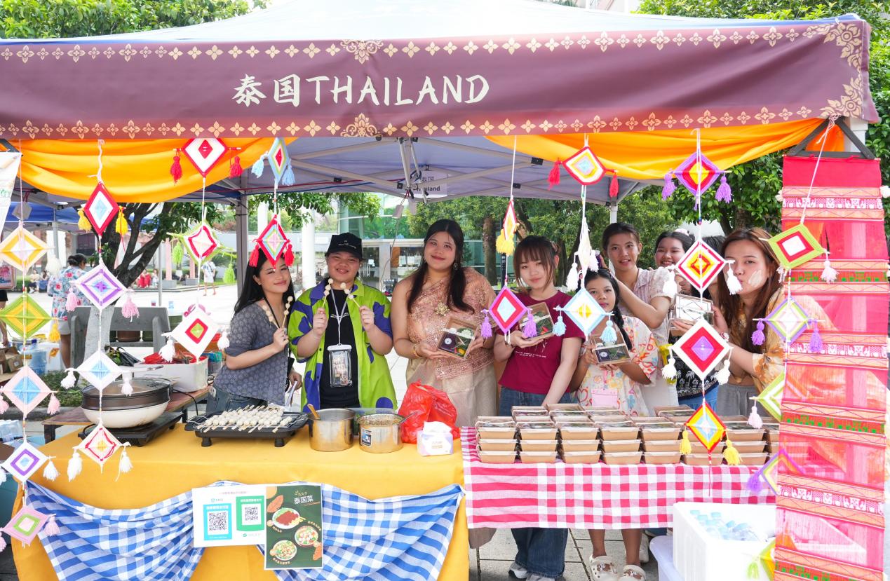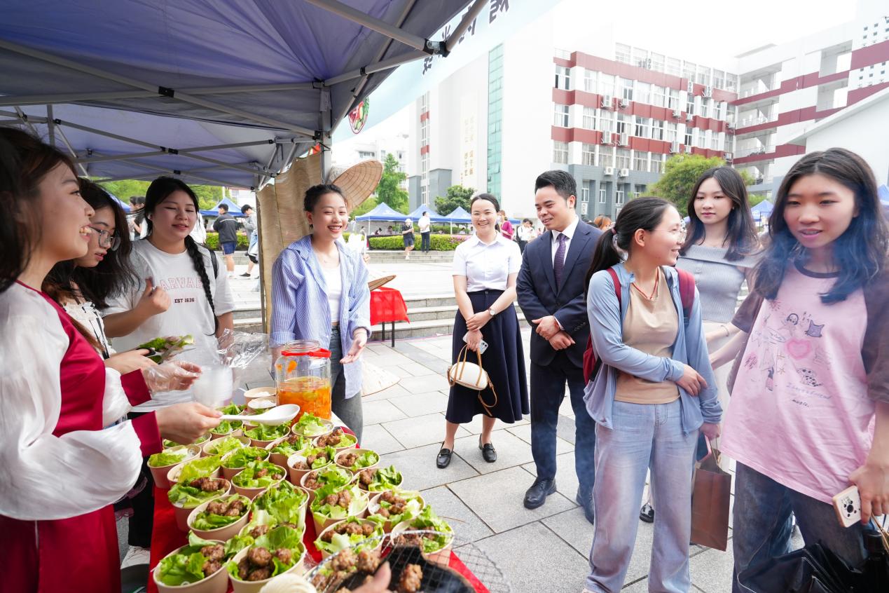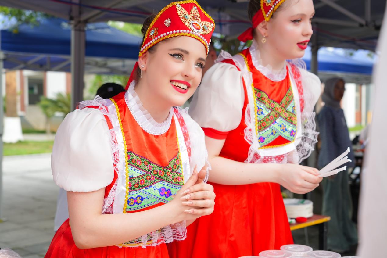 国际文化节设有文化展台和美食摊位,在孔子广场,各国美食琳琅满目,香气四溢,吸引了大量师生驻足品尝。展台上,来自不同国家的学生们身着民族服饰,热情地介绍着自己国家的特色美食和文化习俗。从越南的春卷,到泰国的奶茶、老挝的木瓜沙拉,再到俄罗斯的煎饼,每一种美食都让人垂涎欲滴。此外,文化展台上还展示了各国的传统手工艺品、服饰等,让师生们更加直观地了解各国的文化。来自资源县社岭村和猴背村的村民们带来了瑶族民俗表演、打油茶还有土特产售卖等,实现我校多维度助力乡村振兴。