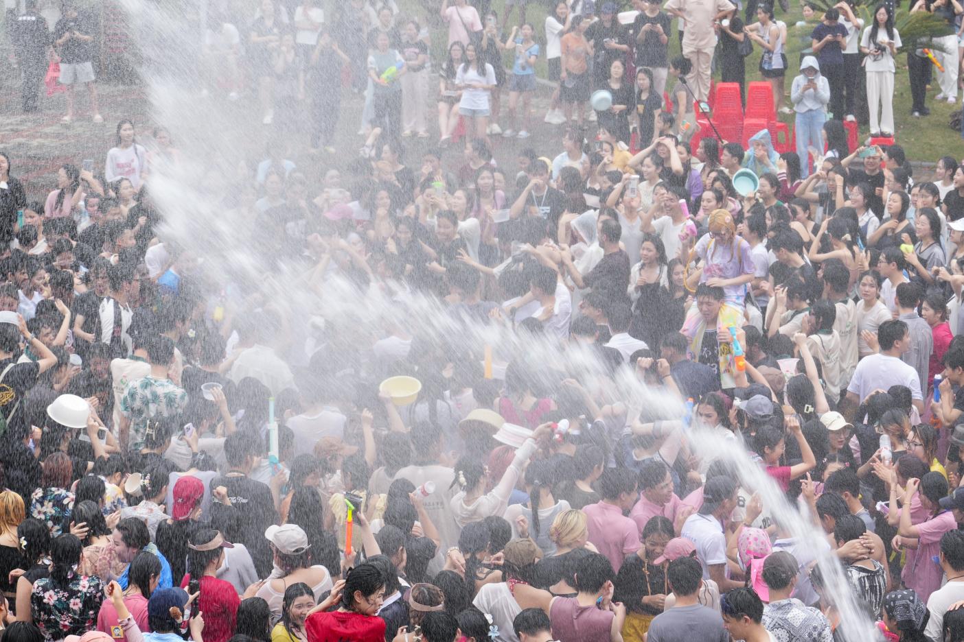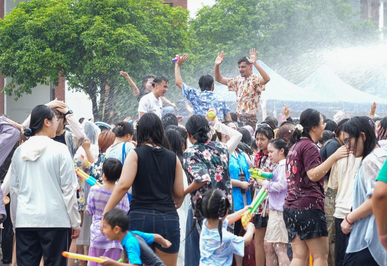 文艺表演结束后,万众期待的泼水游戏环节开始了。几百名中外师生和小朋友们加入泼水游戏,大家跟着音乐起舞,互相泼水送上祝福。
