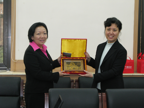 王枬书记向首都师范大学党委副书记林蓉蓉赠送学校纪念品